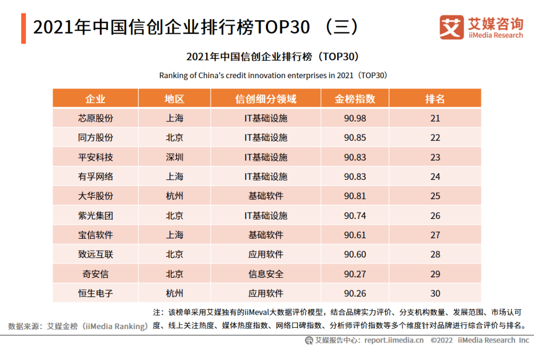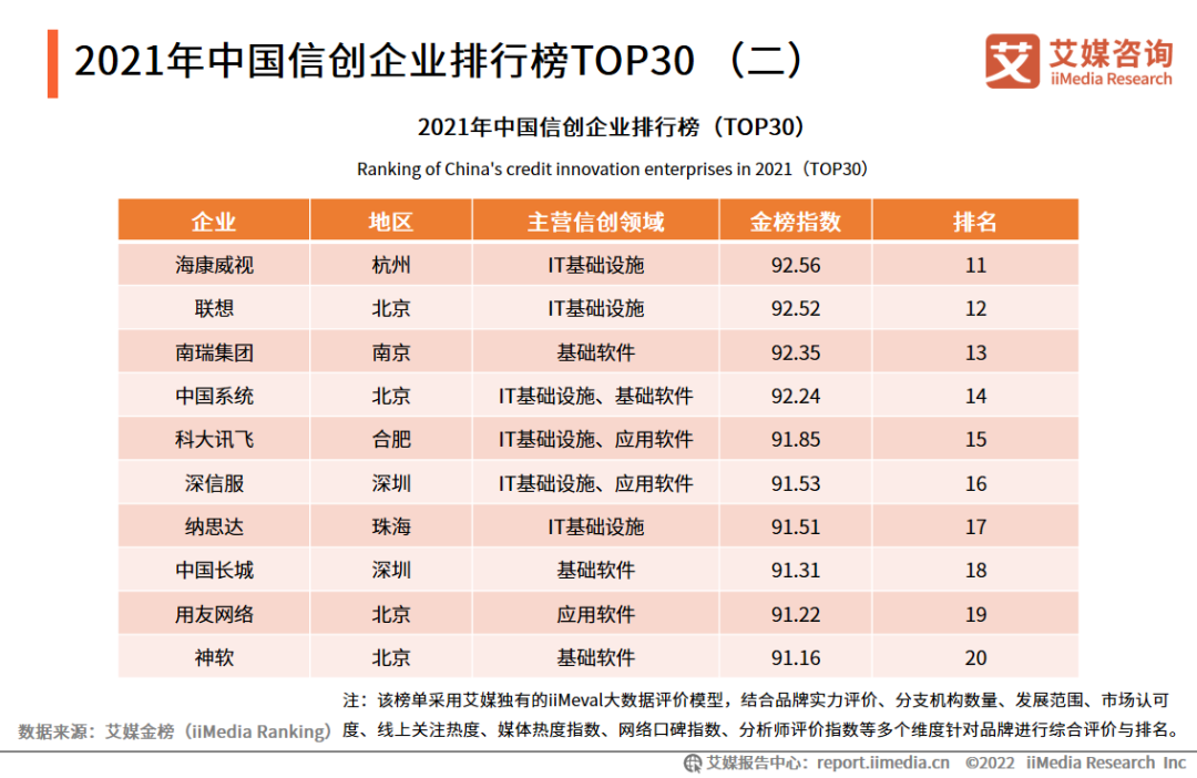 在iiMedia Ranking艾媒金榜最新发布的《 2021年中国信创企业排行榜Top30 》中,前三十名企业覆盖领域主要以IT基础设施为主。