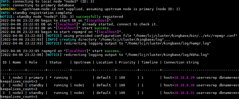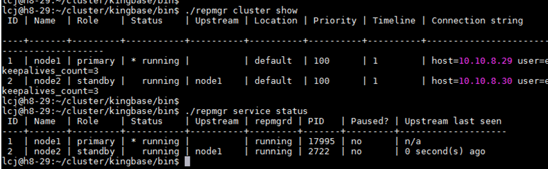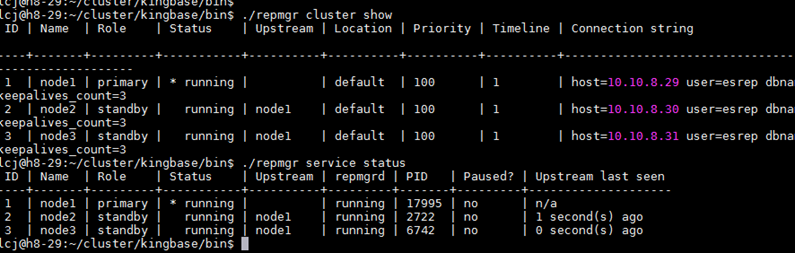 3.集群主节点bin目录下执行:repmgr cluster show / repmgr service status,确认新扩容节点已正确加入集群,集群状态正常。