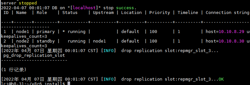 3.集群主节点bin目录下执行:repmgr cluster show / repmgr service status,确认缩容节点已正确从集群移除,集群状态正常。