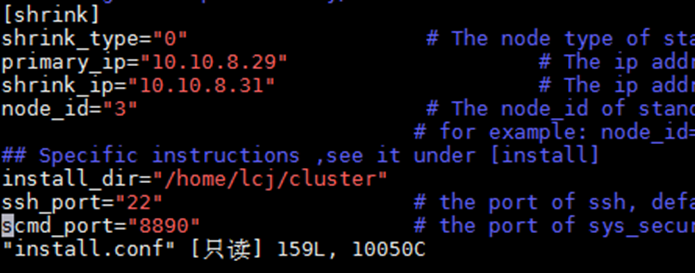 - 待缩容节点配置install.conf文件,正确填写shrink标签下各参数信息。