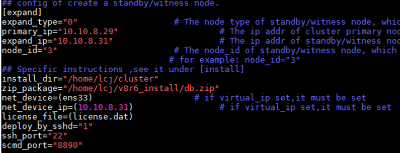 - 待扩容节点配置install.conf文件,正确填写expand标签下各参数信息。