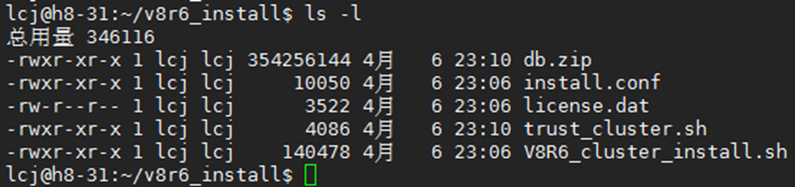 4. 使用集群安装用户在待扩容/缩容节点新建文件夹v8r6_install,将压缩包db.zip、脚本文件 V8R6_cluster_install.sh、配置文件install.conf、免密配置脚本trust_cluster.sh、license文件上传至v8r6_install,需注意文件权限属主需为集群安装用户。