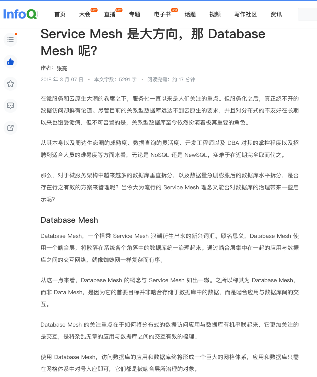 此外,Database Mesh 发起人张亮所在的 SphereEx 公司将于下月推出面向数据库网格的开源解决方案 Pisanix( https://www.pisanix.io ),欢迎各位关注。