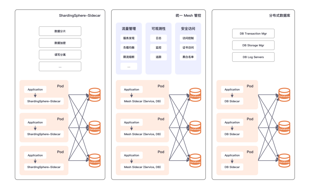 注:从左往右分别为“ShardingSphere-Sidecar、统一 Mesh 管控、分布式数据库”三种 Database Mesh 1.0 的实现。