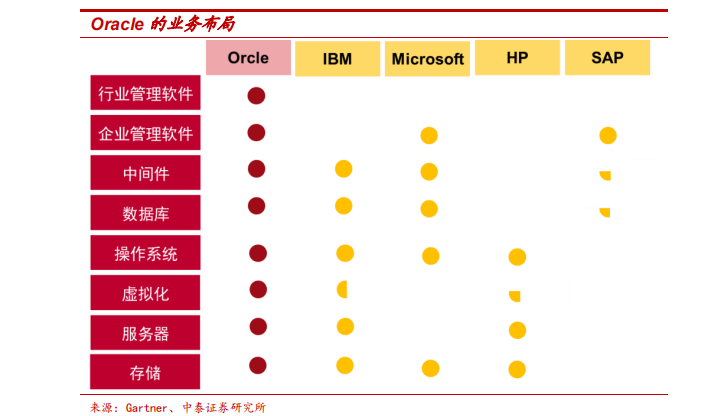 从 Oracle 公司自身来看,Oracle 可以说是全球软件巨头,体量虽然没有 Microsoft 那么大,但(1)在数据库和应用软件领域,Oracle 的确实有其难以撼动的地位。(2)在 IT 布局的完备性方面,Oracle 应该是继 IBM 之后(在 IBM 发展中,其业务发生多次调整和分拆),在全球 IT巨头中布局最为完整、最为完善的一家。我们这里所说的 IT 完备性主要是基于 IT 基础产业链角度。