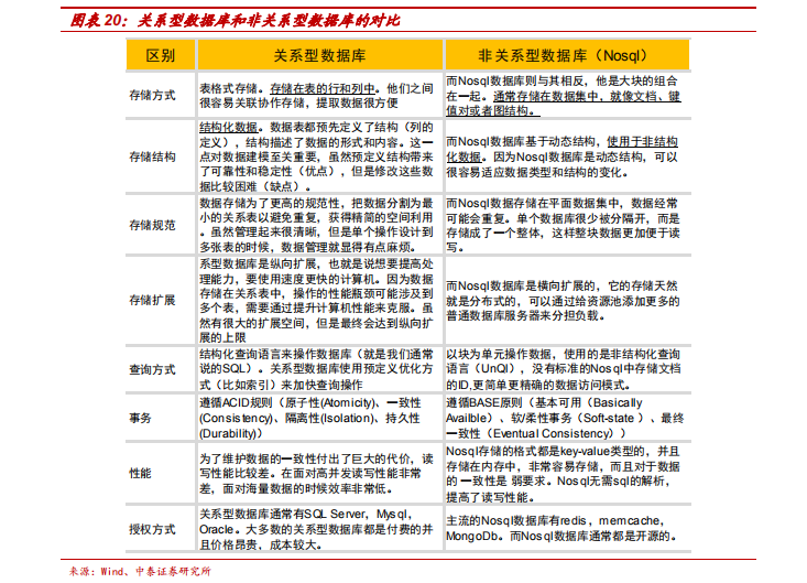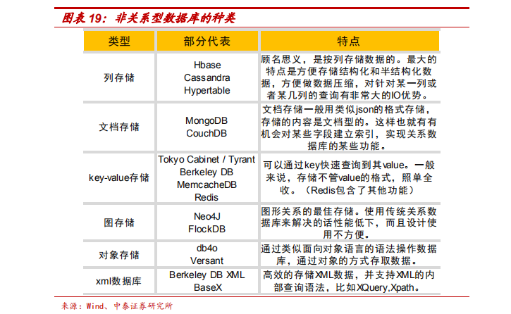 数据库:关系型数据库&非关系型数据库。在数据库产品的演进中,其基于的数据模型也在发生变化。根据数据模型的不同,数据库可以分为关系型数据库和非关系型数据库。关系型数据库的底层数据模型是关系模型。非关系型数据库是一个大类,其又可以分为不同种类的数据库。比如,面向高性能并发读写的 key-value 数据库,面向海量数据访问的面向文档数据库,面向可扩展性的分布式数据库等。