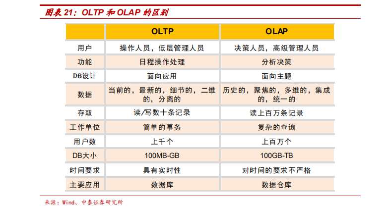 数据处理大致可以分成两大类:联机事务处理 OLTP(on-line transaction processing)、联机分析处理 OLAP(On-Line Analytical Processing)。OLTP 是传统的关系型数据库的主要应用,主要是基本的、日常的事务处理,例如银行交易。OLAP 是数据仓库系统的主要应用,支持复杂的分析操作,侧重决策支持,并且提供直观易懂的查询结果。