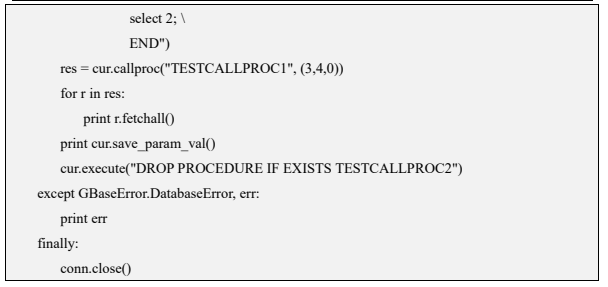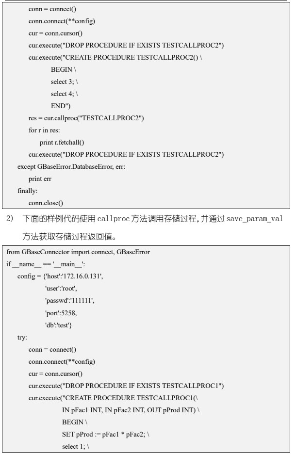使用游标的 callproc 方法可以调用 GBase 数据库的存储过程。存储过程返