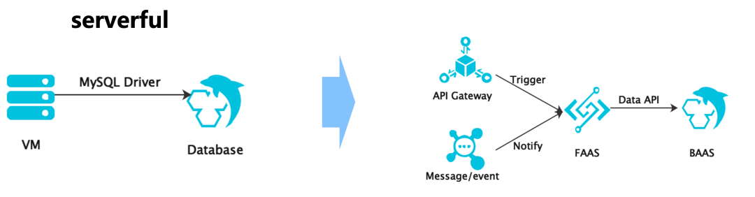 其中尤其要注意的是第2点,在应用进FAAS之后,当前的数据库访问方式已经不适用于Serverless生态: