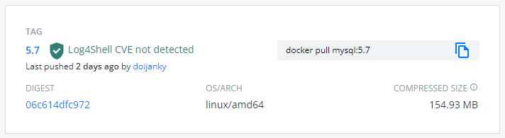 $ docker pull mysql:5.75.7: Pulling from library/mysqlc1ad9731b2c7: Pull complete54f6eb0ee84d: Pull completecffcf8691bc5: Pull complete89a783b5ac8a: Pull complete6a8393c7be5f: Pull completeaf768d0b181e: Pull complete810d6aaaf54a: Pull complete81fe6daf2395: Pull complete5ccf426818fd: Pull complete68b838b06054: Pull complete1b606c4f93df: Pull completeDigest: sha256:7e99b2b8d5bca914ef31059858210f57b009c40375d647f0d4d65ecd01d6b1d5Status: Downloaded newer image for mysql:5.7