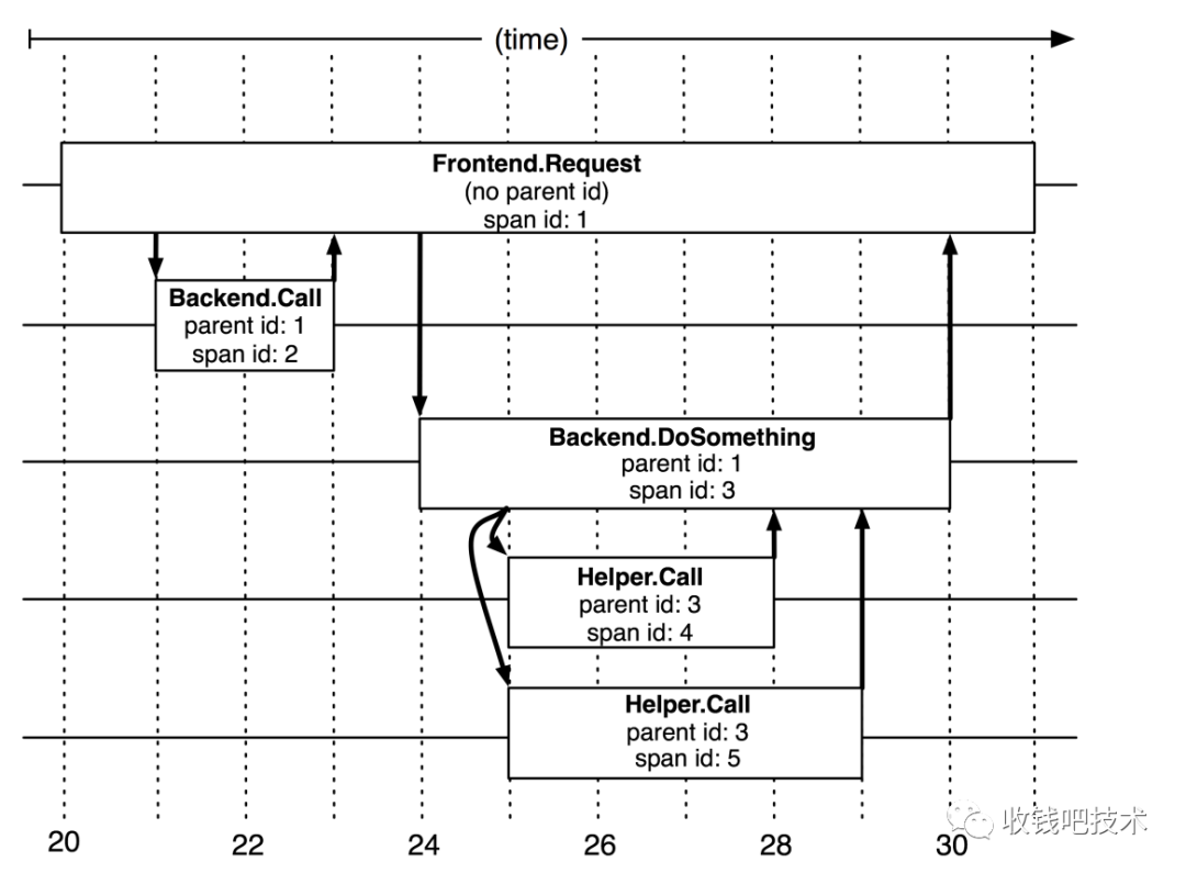 在一个Dapper链路树中,各个Span之间存在因果和时序关系。