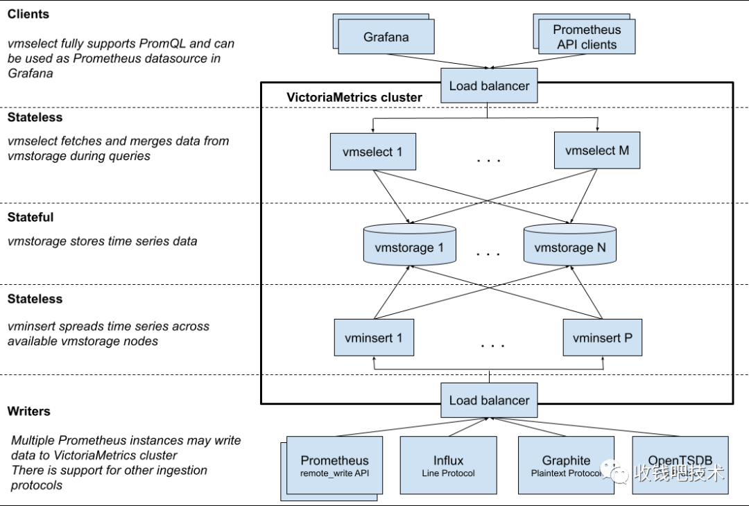 VM的各个组件都是独立的,可以水平扩展,只有核心的vmstorage是有状态的,其他组件均是无状态的。