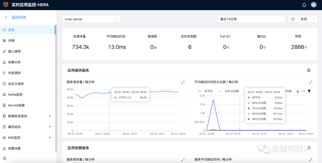 Servlet容器指标:Tomcat忙碌线程数,百分比, 数据库连接池指标:支持HikariCP和Alibaba/Druid连接池,等待连接池的线程数,数据库连接获取时间,数据库连接池使用占比, 缓存指标:支持Redis,Caffeine和EhCache。缓存命中率, Kubernetes监控:Pod CPU、内存使用量,我们也在系统中也集成了Kubernetes事件的查看和搜索。