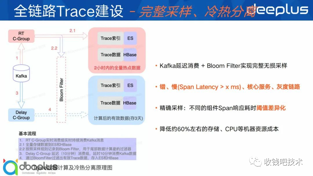 实时消费队列:根据采样规则写入Bloom过滤器,热数据全量写入热存储, 延迟消费队列:根据Bloom过滤器实现条件过滤逻辑,冷数据写入冷存储。