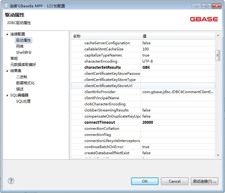 然后计入编辑连接界面,点击“驱动属性”,找到“characterSetResults”属性,并将该值设置为GBK,点击“确定”按钮重新连接该链接即可,如下图所示: