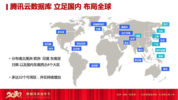 基于这样一个大的趋势,腾讯云数据库在积极的布局,我们在全球都在部署可用区域,目前已经多达32个可用区,提供数据的访问,我们也在持续的增加。腾讯云数据库布局全球,我今天想分享一下我们的数据库是怎么演变来的。