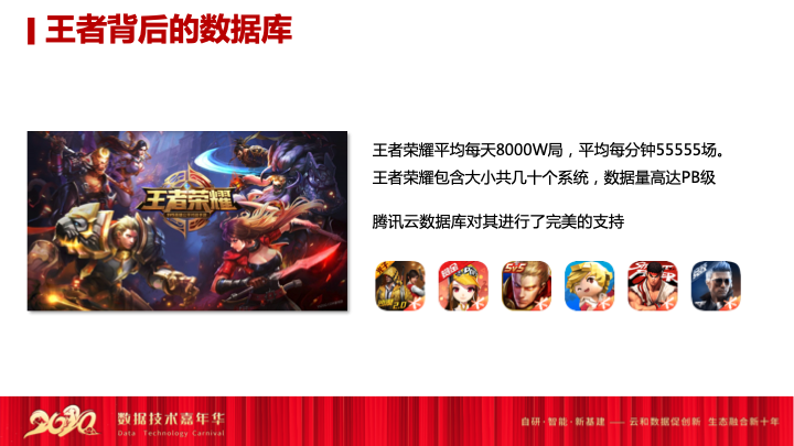第二个名品堂的案例就是王者荣耀,这款产品已经突破了游戏行业正常的生命周期的演进,目前应该是每天还有八千万局的对战,平均五万多场的比赛情况。所以这样一种DAU在一亿以上的国民级的游戏系统,全部都是由腾讯云数据库做底层支撑。王者荣耀包含几十个系统,PB级别的数据存储在腾讯云数据库之上,包括皮肤信息、对战信息等,都需要由腾讯云数据库的底层支撑。