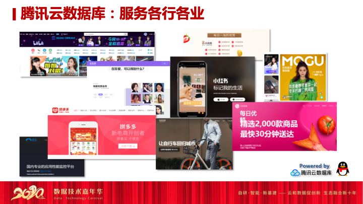 其实腾讯在三Q大战之后,战略层面发生了转变。第一个转变开始做开放平台,一个是腾讯将游戏作为游戏开放平台,另外是将内容作为整体的开放平台,通过游戏跟内容两个抓手来去扩展自己的朋友圈。同时在3Q大战之后,腾讯启动了投资战略,当时提出的是再造一个腾讯。上周的数据,腾讯系目前投资的企业总市值超过了十万亿,按照今天的市值来看,其实已经再造出了两个腾讯。腾讯的生态圈或者朋友圈如此强大,在整个互联网行业内,其实各行各业包括一些明星企业都是腾讯大的朋友圈,或者腾讯大的生态体。作为腾讯云其实也要为这些企业做好良好的业务支撑,而腾讯云数据库也在为这些企业做底层支撑。包括像拼多多、每日优鲜、小红书这样的一些业务,都是使用腾讯云数据库的同时,可以把自己的技术人员投放到自己的业务发展,同时它的数据规模也随着它自己市值的增长和业务的增长,做大踏步的前进。为什么我们可以在短短的几年服务好这些腾讯庞大的朋友圈,或者说这些各行各业一些明星产品呢?我总结有两点是我们为各行各业做好支撑的关键因素。
