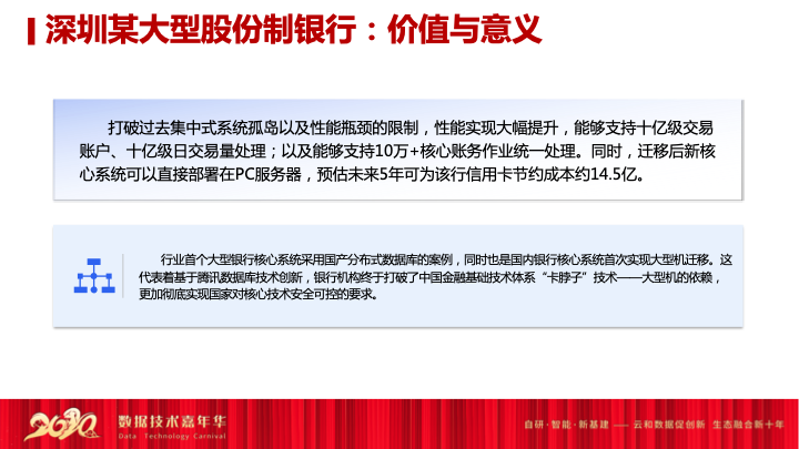 讲完了金融行业看中的这些数据库特性之外,我们最近也是在张家港农行成功之后,腾讯的数据库在股份制银行又有了一次重大的突破。