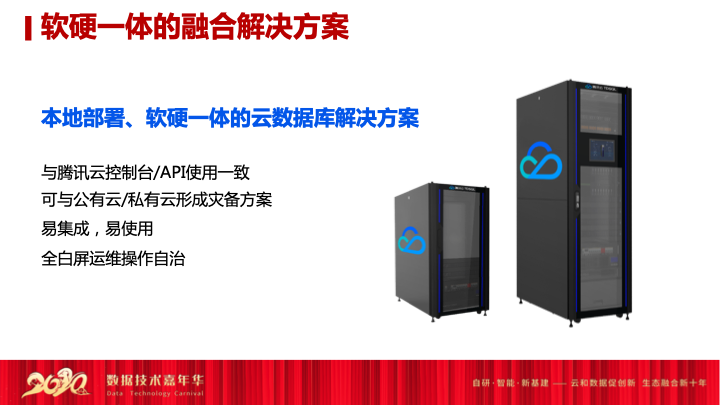 第一个我们发布了由本地部署,可以形成整个规模软硬件一体的解决方案,腾讯云的TDSQL一体机,它是跟腾讯云公有云控制台API使用是完全一致的,它可以将一体机直接搬到线下机房,可以做到公有云跟私有云形成完全的灾备系统,可以实现易集成、易使用、全白屏的操作资质平台。其实它的理念也是可以打破一个个数据孤岛,使用类似Oracle的模式,将所有的数据节点连成片与公有云做结合。它的核心优势是,今天你核心的交易系统必须由线下一体机的模式做输出,比如后续的备份系统和监控系统,都会基于一体机的模式,将数据打通到云上的Cloud系统,可以实现边缘业务或者其他的辅助模块直接上云,实现公有云跟私有云的连接和整体的融合策略。