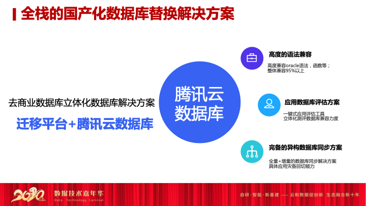 另外其实在政务民生这块,我们今年也在积极的布局全站的国产数据库的解决方案,我们提供了迁移平台+腾讯云数据库全站去商业数据库的方案,有三点特性。第一个是高度的语法兼容,我们现在投入了很多研发经费去做高度语法兼容,目前可能在很多行业,我们已经能做到95%以上的兼容能力。另外我们开发了应用评估方案,用户拿着工具之后,可以一键式形成应用评估,所有的应用,所有数据库的连接方式全部可以操作起来,然后更立体化的去评估源端的商业数据库跟我们腾讯云数据库差异度有多大,这个差异度需要应用去改变,还是需要变化一种使用模式,可以形成一套立体化的测试报告或者说评估报告给客户来展示。这个时候他就可以有效的评估,我今天从这套数据库替换到国产数据库,或者腾讯云的数据库,需要投入多少的研发资源和跟改造。最后是一套完备的异构数据库同步方案,目前我们也在很多行业,包括金融的行业落地,这套工具和平台已经跑了很多的用户。我们评估之后,用户在切换系统之前,其实它需要一套全量+增量的实时同步工具,或者说异构的同步工具,这个东西听起来很简单,但一般的切割跟上线需要半年到一年的时间,要通过这套系统保证实时异构数据流的传输,并且能够提供异构的纠错能力跟检查能力,告诉用户数据延迟有多大,整体的见证性有多高。最后我们也做了一种反向迁移,因为整体业务调整跟发展也需要一个反切的能力。比如说你在腾讯的数据库运行了多长时间之后,把你原来的Oracle或者MySQL作为背景,运行一段时间之后,整体的测试可能还需要把你的数据完全同步回去,实时同步回去,是一个反切的演练,基于整合一体化的平台,腾讯云数据库也对端的能力做了一个完整的布局跟拓展。