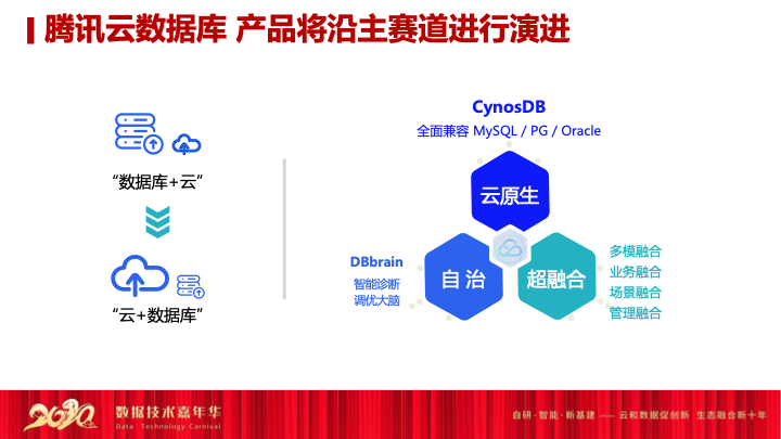 最后,我想讲腾讯云数据库基于这么多年从内部走出来,服务这些明星的名品堂应用,再到服务好腾讯泛互联网的朋友圈,再逐步到金融跟政务行业的服务,其实腾讯云数据库还将不断地探索跟演进。目前腾讯云数据库将沿着自己的主航道继续的演进,以前的数据库或者刚做云的时候,就是一种数据库+云,在原有的数据库之上加上了云的便利性。比如说数据库的便捷模式和服务模式基本不变,只是加上了云的商业模式的变化,从原来的license模式变成服务化的模式,其实更多的是在借助云计算商业上的便利提供云数据库。
