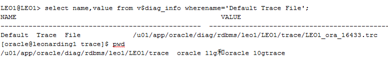 LEO1@LEO1> select name,value from v$diag_info wherename='Default Trace File';