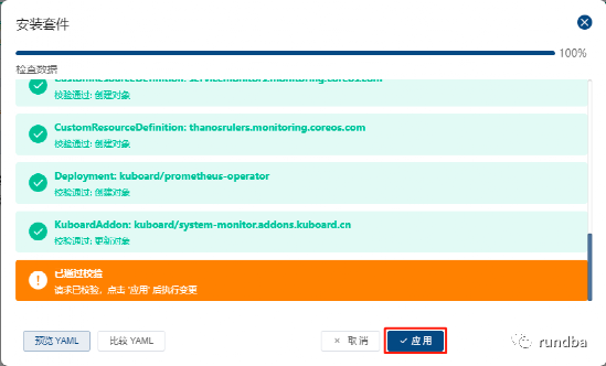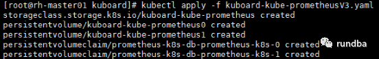 [root@rh-master01 kuboard]# kubectl apply -f kuboard-kube-prometheusV3.yamlstorageclass.storage.k8s.io/kuboard-kube-prometheus createdpersistentvolume/kuboard-kube-prometheus0 createdpersistentvolume/kuboard-kube-prometheus1 createdpersistentvolumeclaim/prometheus-k8s-db-prometheus-k8s-0 createdpersistentvolumeclaim/prometheus-k8s-db-prometheus-k8s-1 created