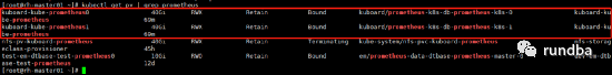 [root@rh-master01 ~]# kubectl get pv | grep prometheuskuboard-kube-prometheus0 40Gi RWX Retain Bound kuboard/prometheus-k8s-db-prometheus-k8s-0 kuboard-kube-prometheus 69mkuboard-kube-prometheus1 40Gi RWX Retain Bound kuboard/prometheus-k8s-db-prometheus-k8s-1 kuboard-kube-prometheus 69mnfs-pv-kuboard-prometheus 40Gi RWX Retain Terminating kube-system/nfs-pvc-kuboard-prometheus nfs-storageclass-provisioner 45htest-em-dtbase-test-prometheus0 10Gi RWO Retain Bound em/prometheus-data-dtbase-prometheus-master-0 dev-em-dtbase-test-prometheus 12d