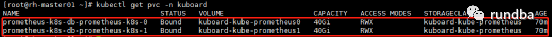 [root@rh-master01 ~]# kubectl get pvc -n kuboardNAME STATUS VOLUME CAPACITY ACCESS MODES STORAGECLASS AGEprometheus-k8s-db-prometheus-k8s-0 Bound kuboard-kube-prometheus0 40Gi RWX kuboard-kube-prometheus 70mprometheus-k8s-db-prometheus-k8s-1 Bound kuboard-kube-prometheus1 40Gi RWX kuboard-kube-prometheus 70m