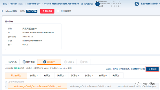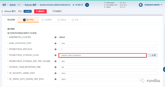 套件参数页面,在PROMETHEUS_STORAGE_CLASS一栏填入之前创建的StorageClass:kuboard-kube-prometheus