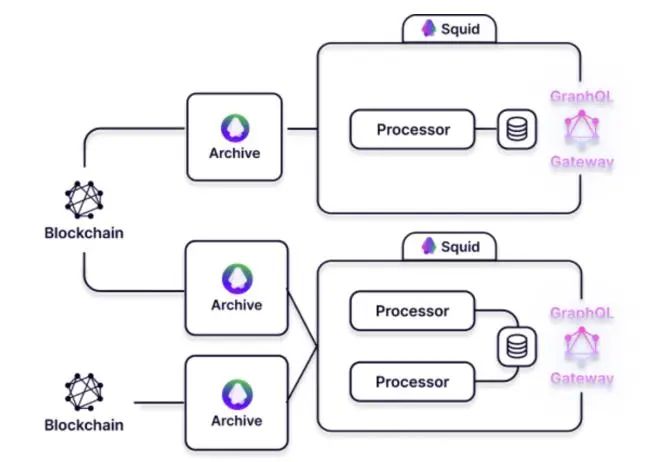 分层(The layering)由两种类型的节点组成:Squids 对数据进行分类并支持后续的 api 查询,Archives 则持续从底层状态机中提取原始数据并将其保存到数据库中。