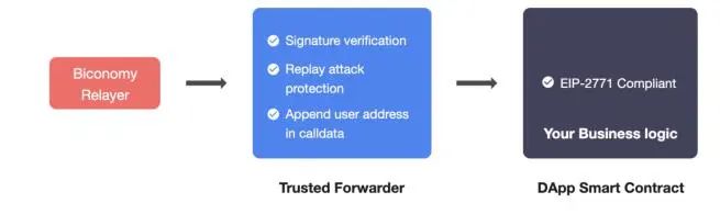 Biconomy 通过使用 ERC2771 协议和巧妙的转发设计实现无 gas 交易。跨链功能由链上的流动性池支持,使用链下服务器(执行器节点)来监控流动池中的跨链交易,完成验证后放行另一端的资产。
