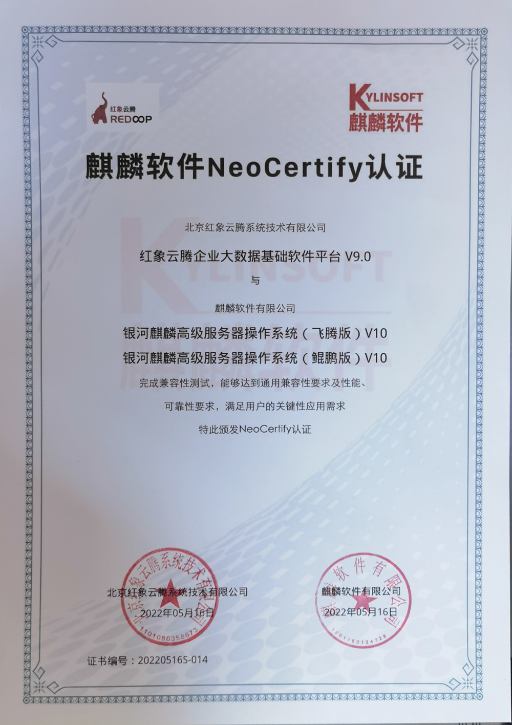 近日,红象云腾企业大数据基础软件平台V9.0与麒麟软件的银河麒麟高级服务器操作系统(飞腾版)V10、银河麒麟高级服务器操作系统(鲲鹏版)V10完成产品兼容性互认证。在飞腾和鲲鹏平台上经过严格的联合测试验证,双方产品兼容性良好,能够达到兼容性要求及性能可靠性要求,可满足用户的关键性应用需求。