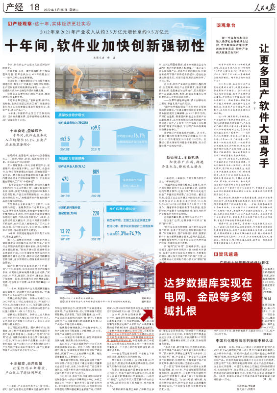5月25日,《人民日报》18版关注软件产业发展,点评基础软件关键核心技术研发,在数据库领域特别提及达梦,文中提到“达梦数据库实现在电网、金融等多领域扎根”,这是对达梦数据极大的认可。