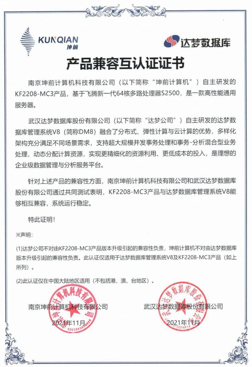 达梦数据与坤前计算机、北大医信完成产品兼容性互证