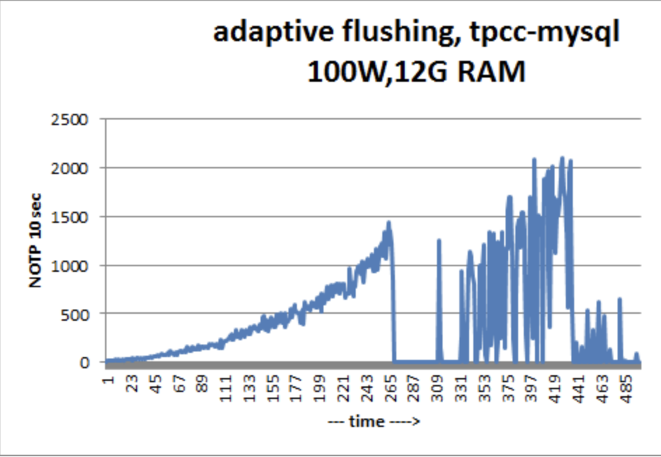 我们可以看到在 time = 265 时 NOTP(每秒新订单事务)急剧下降,这是因为 InnoDB 达到了最大检查点年龄并且不得不疯狂地刷新页面。这通常被称为 flush storm 。flush storm 阻塞了写操作,对数据库操作极为不利。有关flush storm的更多详细信息,请参阅InnoDB 刷新:理论和解决方案。