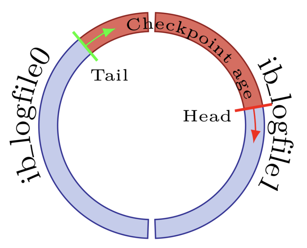 InnoDB 日志文件形成一个包含未刷新修改的环形缓冲区。上图显示了环形缓冲区的粗略表示。Head 指向 InnoDB 当前正在写入事务数据的位置。Tail 指向最旧的未刷新数据修改。Head 和 Tail 之间的距离就是 checkpoint age。checkpoint age以字节表示。日志文件的大小和数量决定了最大checkpoint age,最大checkpoint age约为日志文件总大小的 80%。