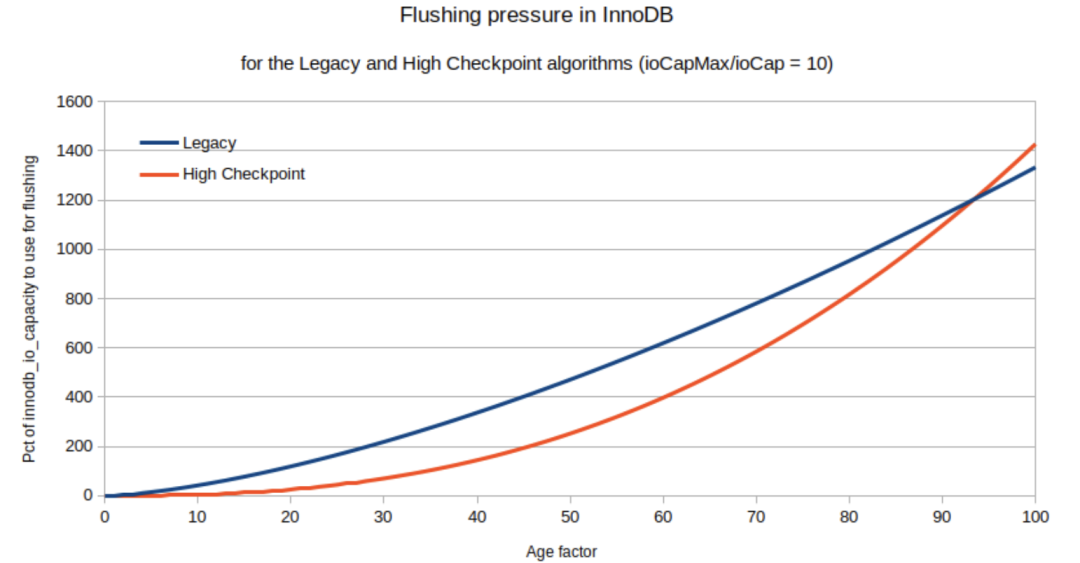 该算法的目标是使刷新率(Tail 的速度)适应checkpoint age的更新(Head的速度) . 当  checkpoint age 大于 自适应刷新低水位时(默认是10%),则系统启动自适应刷新。Percona Server for MySQL 提供两种算法 Legacy 和 High Checkpoint