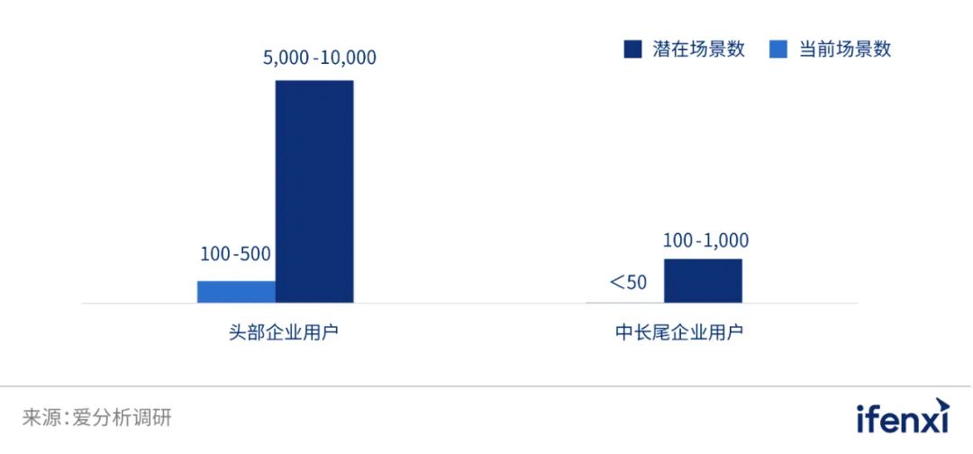 在这样的背景下,企业内部的数据分析与应用数量急剧增长,除了传统基于结构化数据的BI应用,实时数据处理与分析的需求在快速增加。与此同时,大量的创新性的AI/ML应用层出不穷。根据爱分析预测,头部企业潜在AI/ML应用场景数量最多可达到5000到10000例,中长尾企业的AI/ML应用场景数量可达到100到1000例。