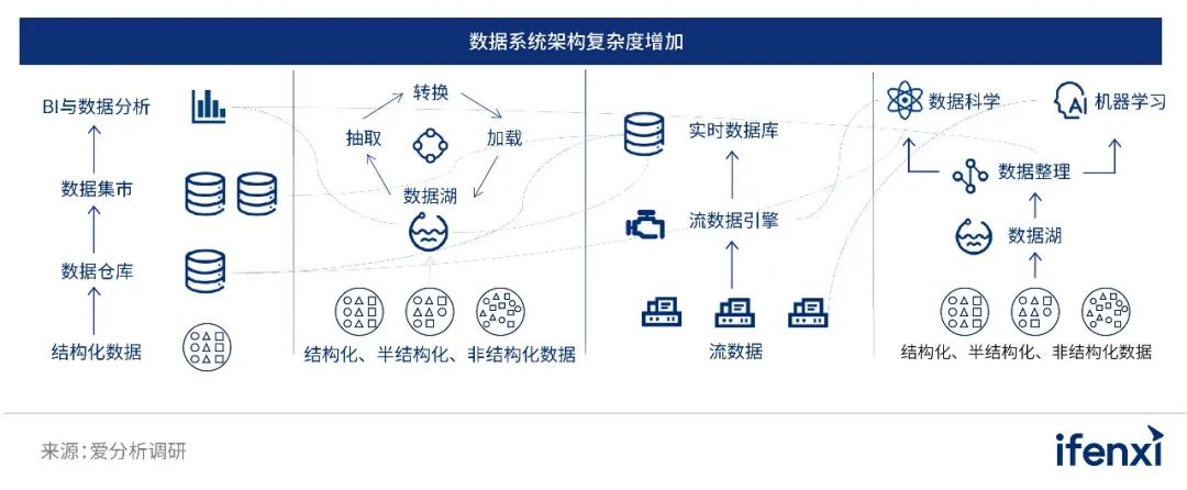 以Hadoop为代表的数据湖出现在2005年之后。在该阶段,由于互联网的兴起,企业需要处理的数据呈现出多类型、大规模的特点。一方面,数据类型除了包含大量结构化数据,为包含了各类半结构化数据(如CSV、XML、日志)、非结构化数据(如文档、图片、音频、视频)。另一方面,数据量从GB或TB级进一步提升至 TB或PB级。与此同时,企业的数据分析的应用场景已经变得更加丰富,除了传统的数据查询、固定报表,也出现了大量面向业务监测和洞察的自助式分析,并且出现了一定的实时性数据分析场景。