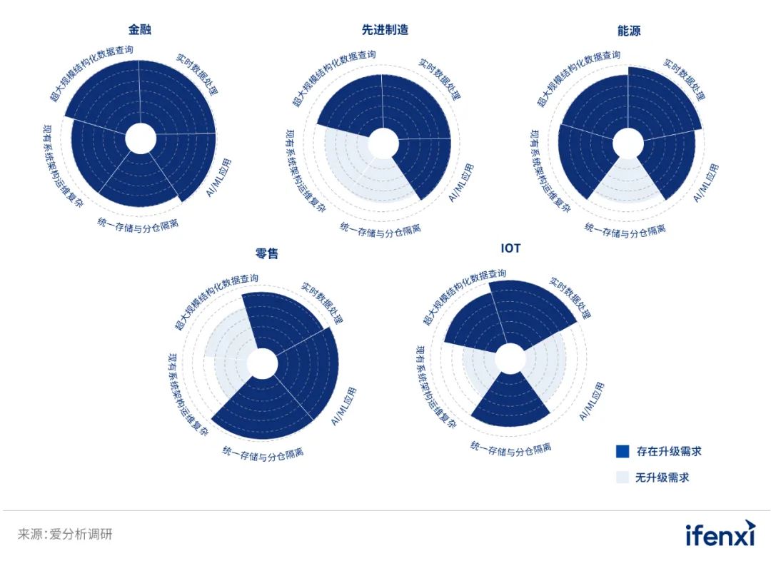 受产业特性、行业和企业发展阶段,企业数字化程度等因素影响,国内企业在实践中对上述因素的需求程度存在较大差异。对此,我们对多个行业企业的相关需求进行了调研,发现金融、能源、先进制造、零售等行业企业目前存在多个显著的数据处理与分析需求升级因素。