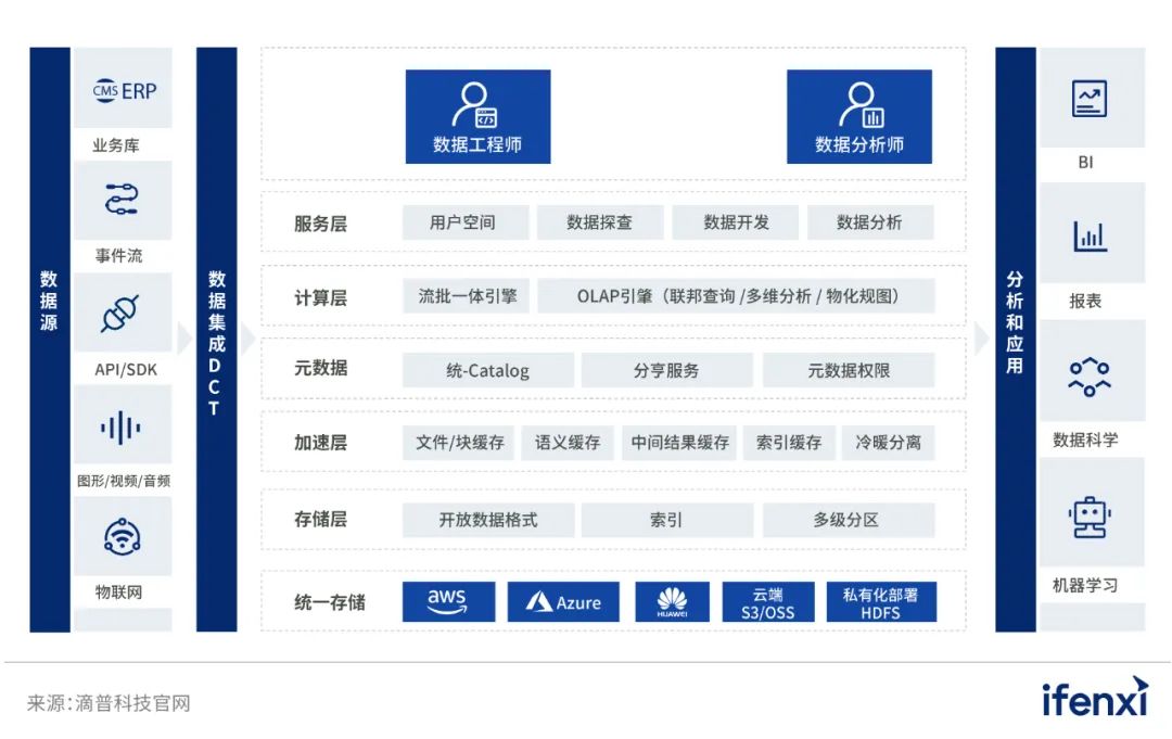 技术架构先进、满足多种分析场景。新锐数据库厂商在技术架构上很多采用了全新一代的设计,包括了湖仓一体、流批一体、云原生等,并且对存储计算引擎做了大量优化,能够以低成本、高性能满足企业的多种分析需求。以滴普科技为例,其智能湖仓产品FastData底层采用了统一的数据存储,通过统一技术元数据层实现完善的数据管理能力,并对接各类分析引擎,满足企业对多模数据统一存储与处理,以及批处理、流式计算、交互式分析、机器学习等各类分析需求。同时,FastData采用流批一体架构,能够实现PB级数据秒级实时分析。