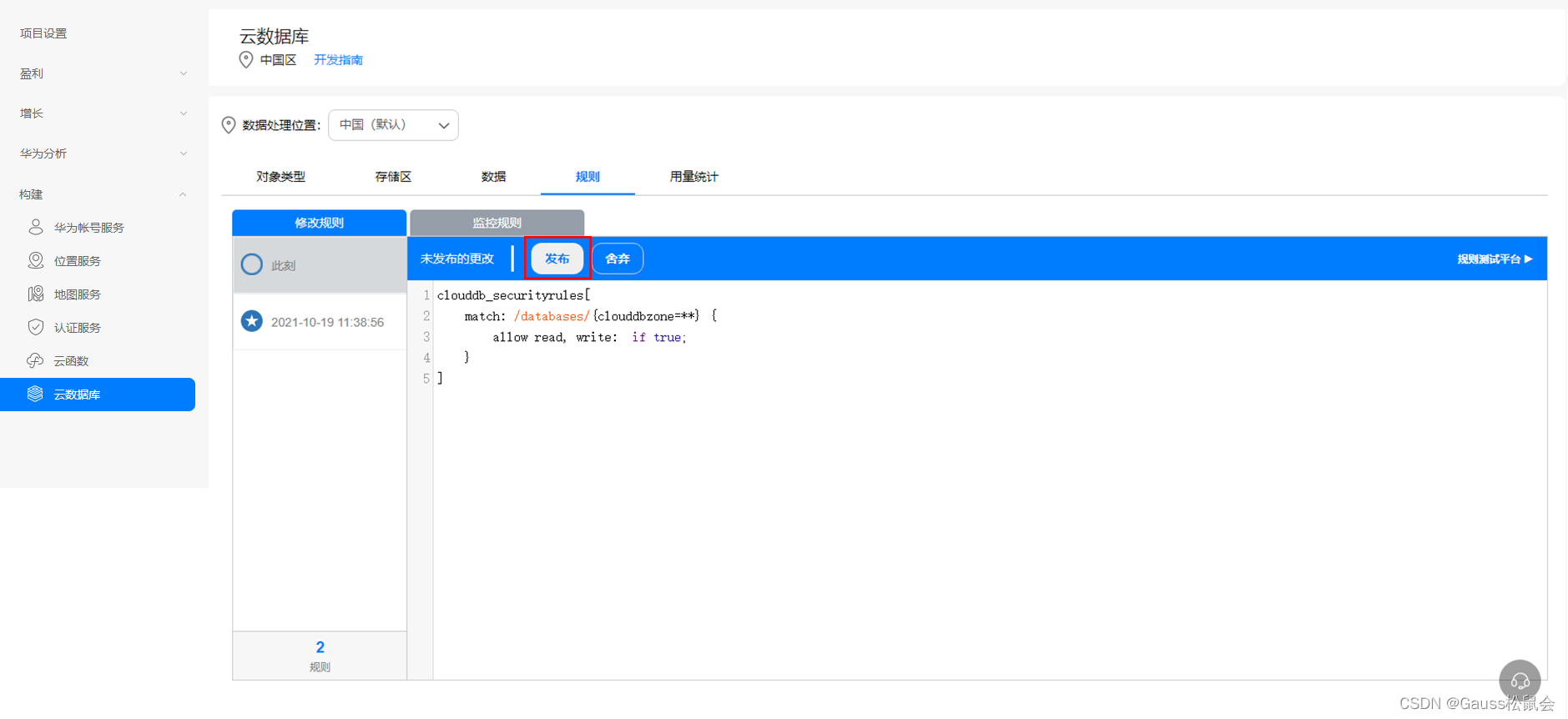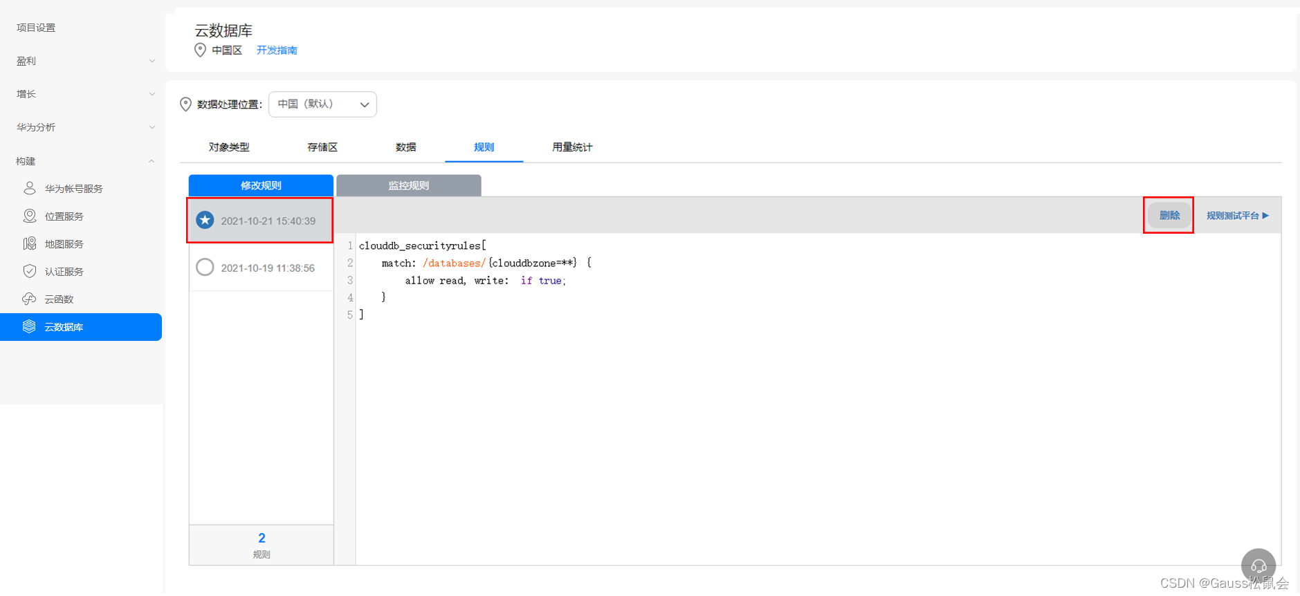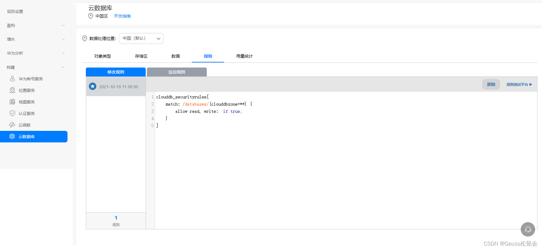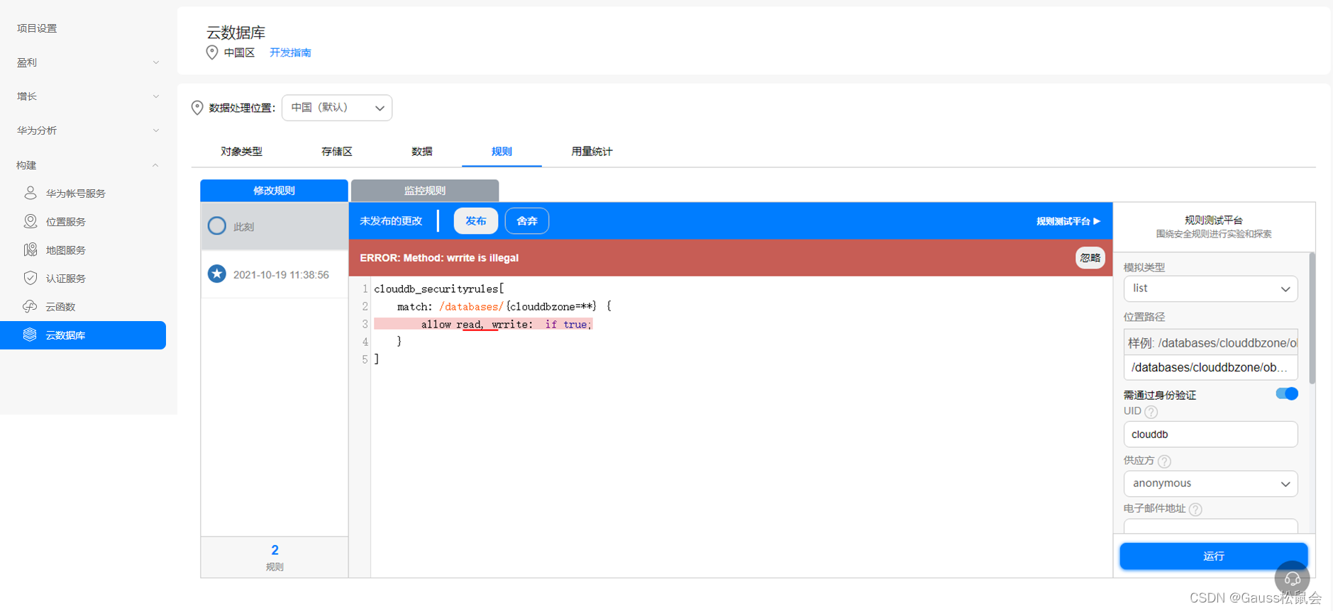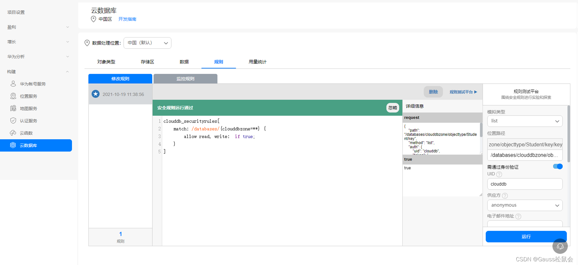 AppGallery Connect控制台提供规则测试平台,供您快速测试Cloud DB安全规则。