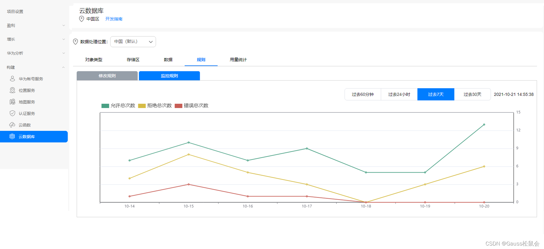 - 页面展示当前应用下安全规则的允许总次数、拒绝总次数、错误总次数。您可以在页面右上角选择需要查看数据的时间段(过去60分钟、过去24小时、过去7天以及过去30天)。单击图表左上侧的允许总次数、拒绝总次数或者错误总次数,可以选择需要在图表中展示的数据。