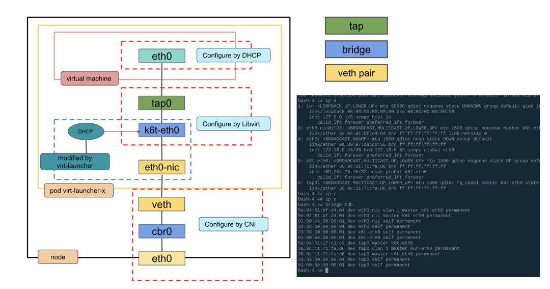 discoverPodNetworkInterface: 获取 Pod 网卡设备相关的信息,包括 IP 地址,路由,网关等信息 preparePodNetworkInterfaces:基于前面获取的信息,配置网络 setCachedInterface:缓存接口信息在内存中 setCachedVIF:在文件系统中持久化 VIF 对象,地址 /proc/<virt-launcher-pid>/root/var/run/kubevirt-private/vif-cache-<iface_name>.json
