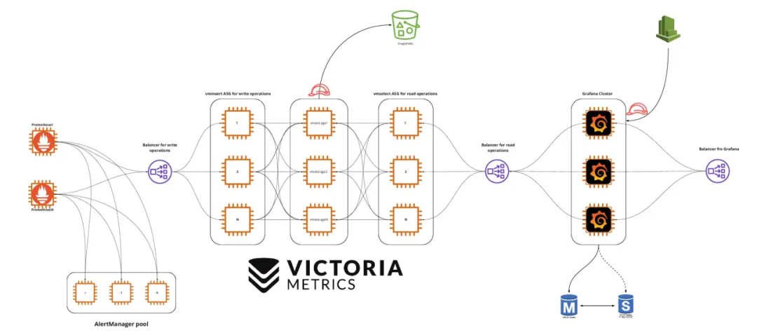 VictoriaMetrics 集群模式相对来说比较复杂。主要由 vmstorage