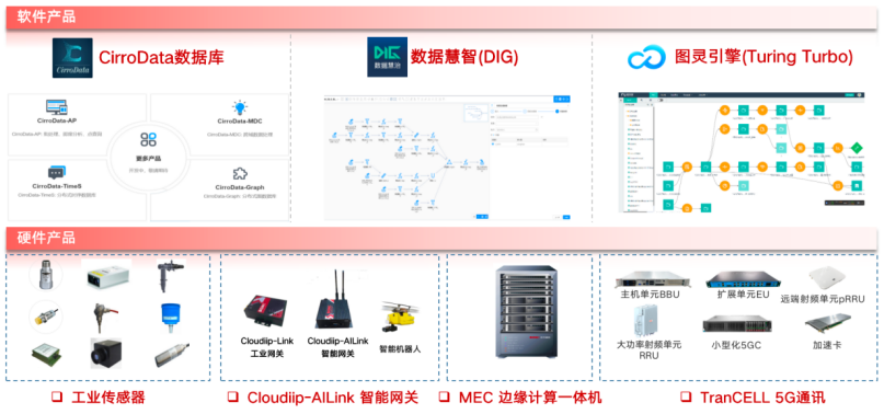 在软件方面,自主研发物联平台Cloudiip-IoT、行云数据库CirroData、数据治理平台DIG、数据科学云平台Turing Turbo,提供面向海量工业数据的接入、存储、管理、计算和分析服务,打造全体系、端到端的数据中台能力。在硬件方面,自主研发5G小基站、5G核心网,提供基于5G行业专网的解决方案TranCELL 5G。工业智能网关Cloudiip AILink,集协议解析、图像处理于一体。边缘一体机Cloudiip-MEC,为端侧设备提供计算、管理能力。