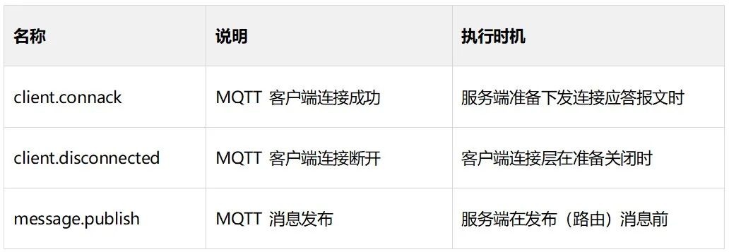## 示例web.hook.enable=trueweb.hook.url=http://127.0.0.1:8888web.hook.headers.content-type=application/jsonweb.hook.body.encoding_of_payload_field=plainweb.hook.pool_size=32web.hook.rule.client.connack.1={"action": "on_client_connack"}web.hook.rule.client.disconnected.1={"action": "on_client_disconnected"}web.hook.rule.message.publish.1={"action": "on_message_publish", "topic": "webhook/msg/#"}
