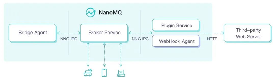 需要强调的是,NanoMQ 的 WebHook 功能是全异步操作,所有匹配到的事件消息都会通过高效的内部 IPC 通道进入独立的专有线程进行处理,与 Broker 功能隔离,不会阻塞原有服务器里正常的消息流转,非常高效可靠。